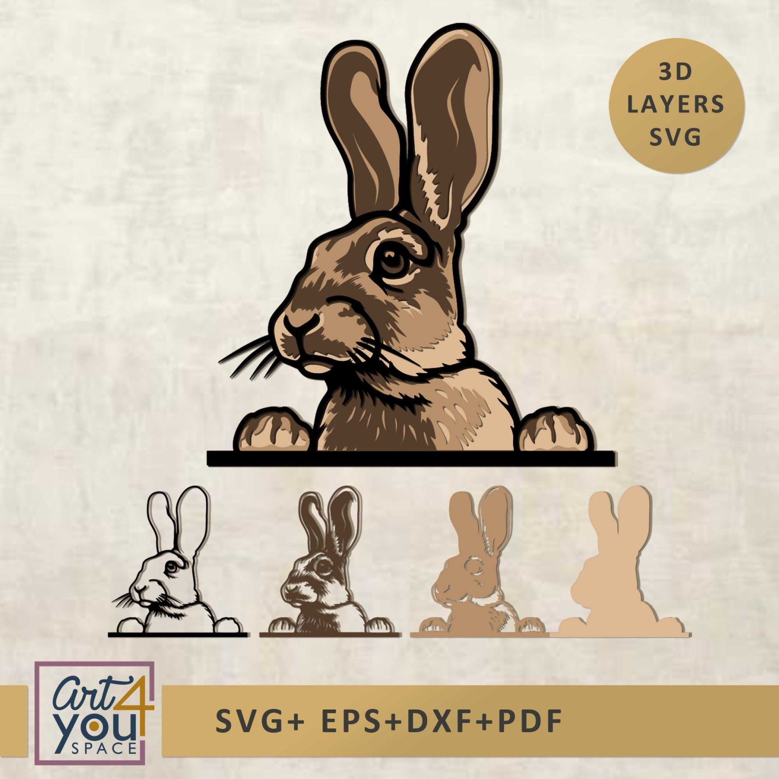 Layered svg design of funny peeking bunny for paper, cardstock and plywood cutting. Rabbit 3D svg design is compatible with laser and Cricut machines.